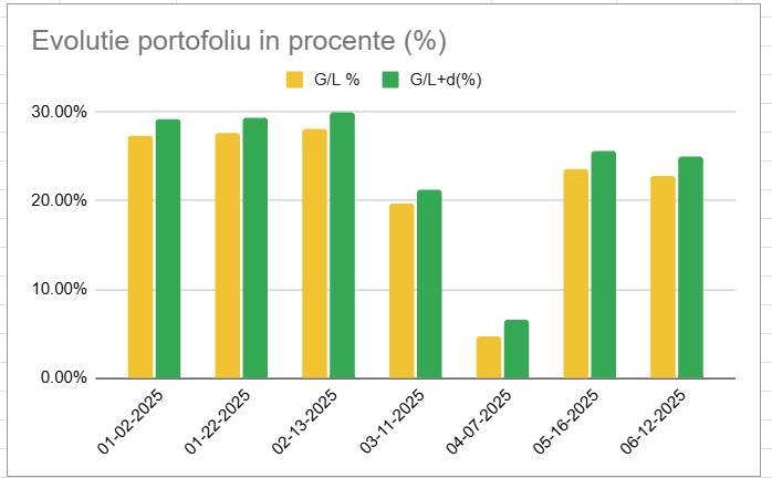 Randamentul YTD este de -3.2%. Mai jos, se poate vedea si evolutia portofoliului, in procente, de la inceput de an – reprezinta procentul profitului reativ la investitii, respectiv profit si dividende relativ la investitii.