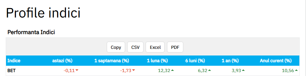 Mai jos gasim un grafic cu evolutia incidelui BET pe diverse perioade de timp. Dupa cum se poate observa, pana in acest moment, in anul 2025, suntem cu un plus de ~10.5%. (la momentul scrierii acestui articol).
